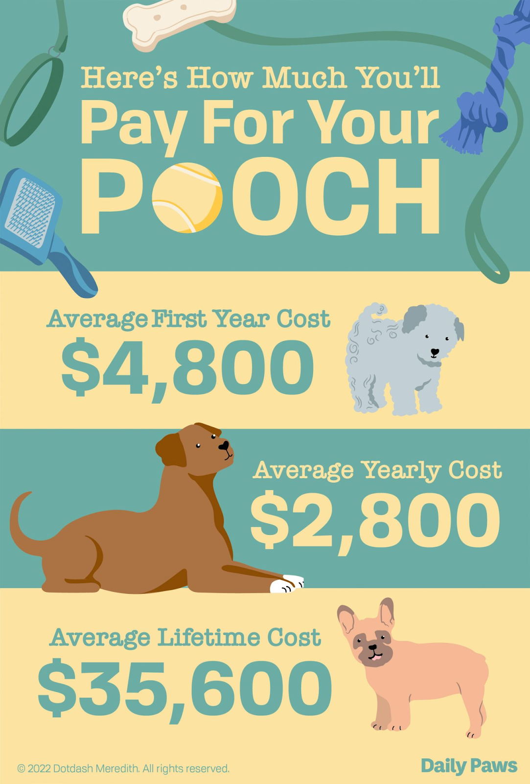 The upfront costs of bringing home a dog range from $1,050 to $4,480, according to a report by Rover.com. "Puppies are generally more expensive since they require more vet visits than adult dogs do," says Nicole Ellis, CPDT-KA and member of the Rover.com Dog People Panel. "They may also go through toys faster and have accidents that require cleaning and washing."